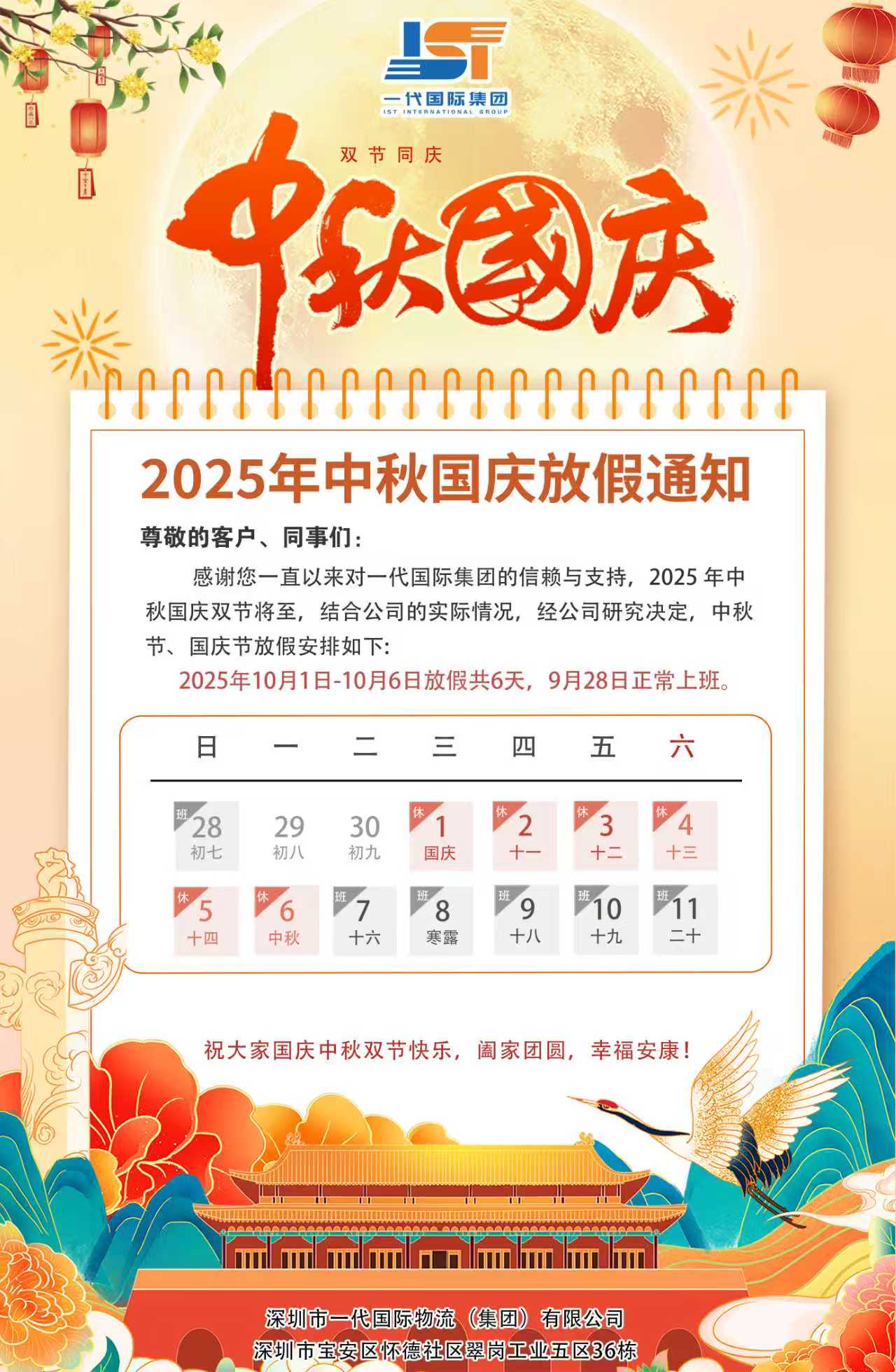 2025年国庆节及中秋节将至,根据国务院办公厅发布的《关于2025年节假日安排的通知》,结合公司的实际情况,经公司研究决定,2025年假期安排如下: